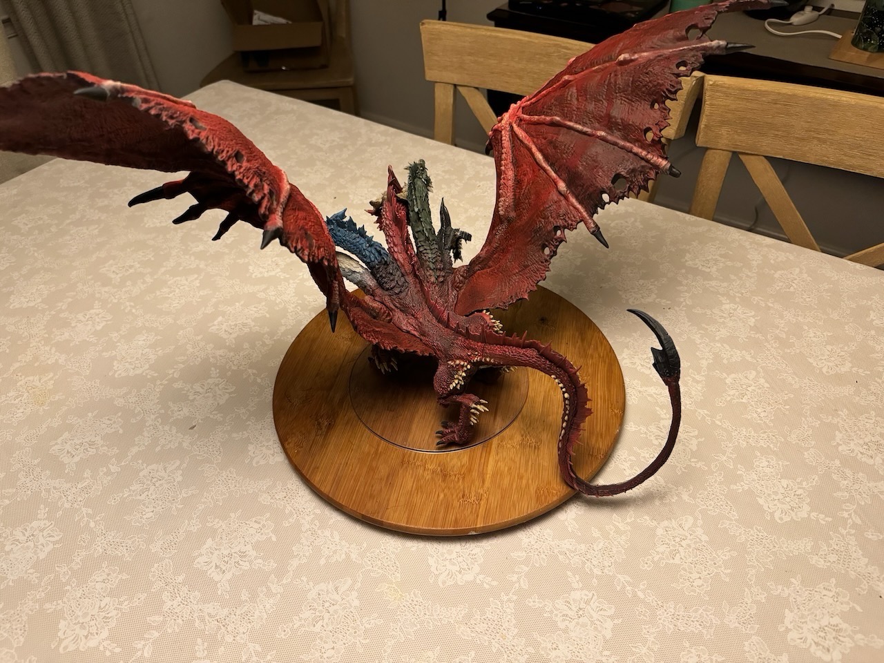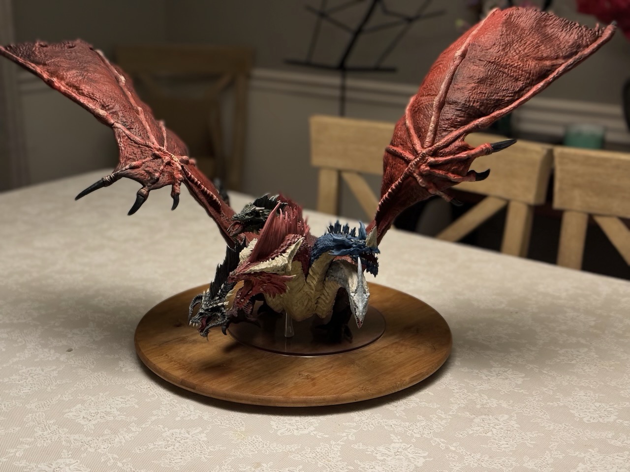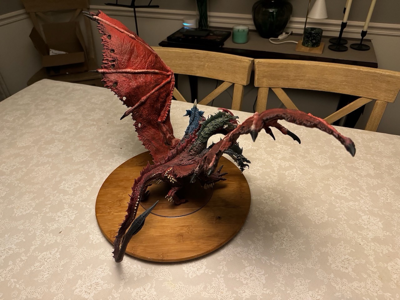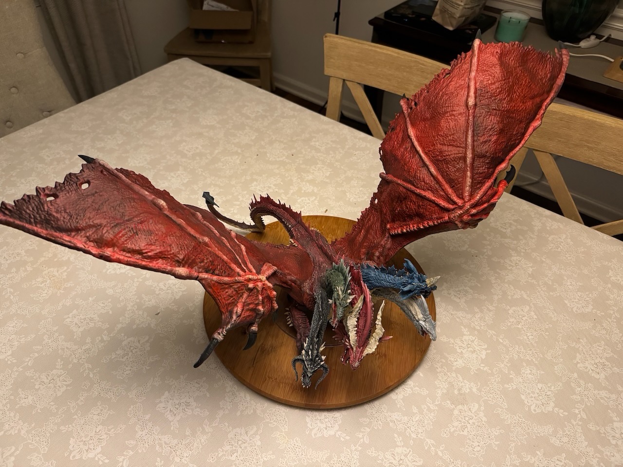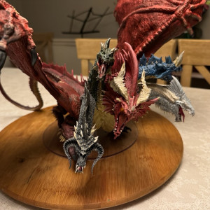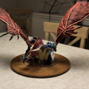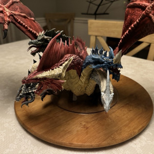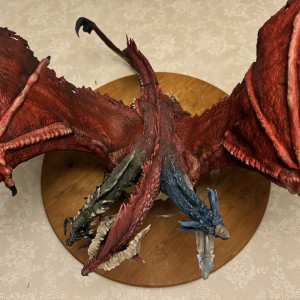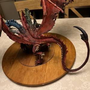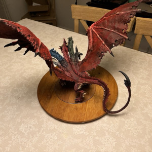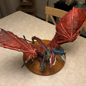 Kicked my painting game up a notch with this beast. I hesitate to even call this a Dungeons and Dragons "miniature" due to the sheer size of this thing. At 14" tall and 28" across at the wings, and even after base coating it with some matte red spray paint, this took a ton of paint. Although I painted it for a friend, and it won't end up in my office, still super happy with the way it turned out. Clocked in close to 30 hours from priming to the finished product. I actually wouldn't mind painting one again and keeping it for myself.