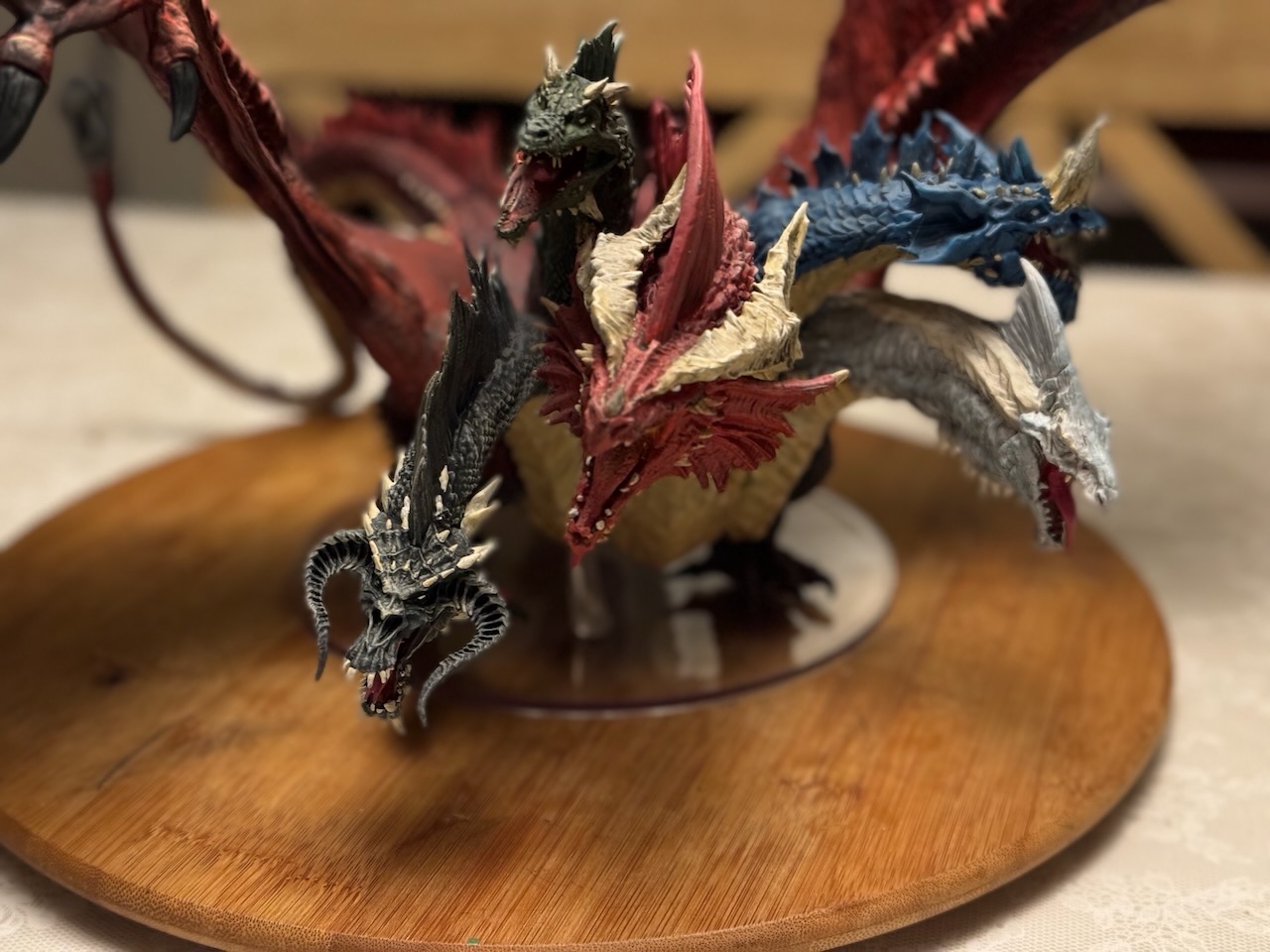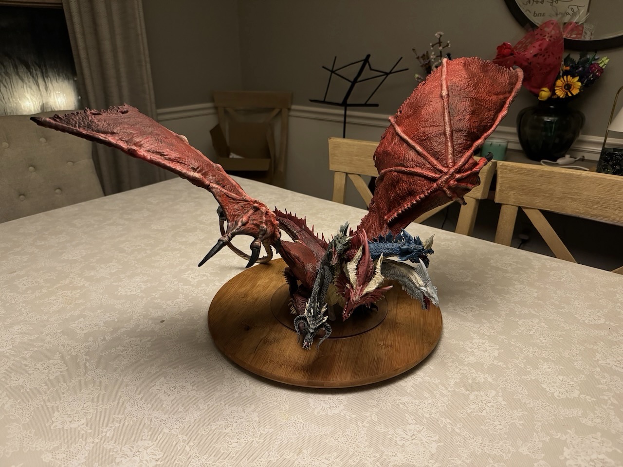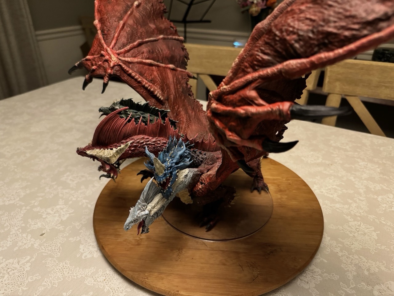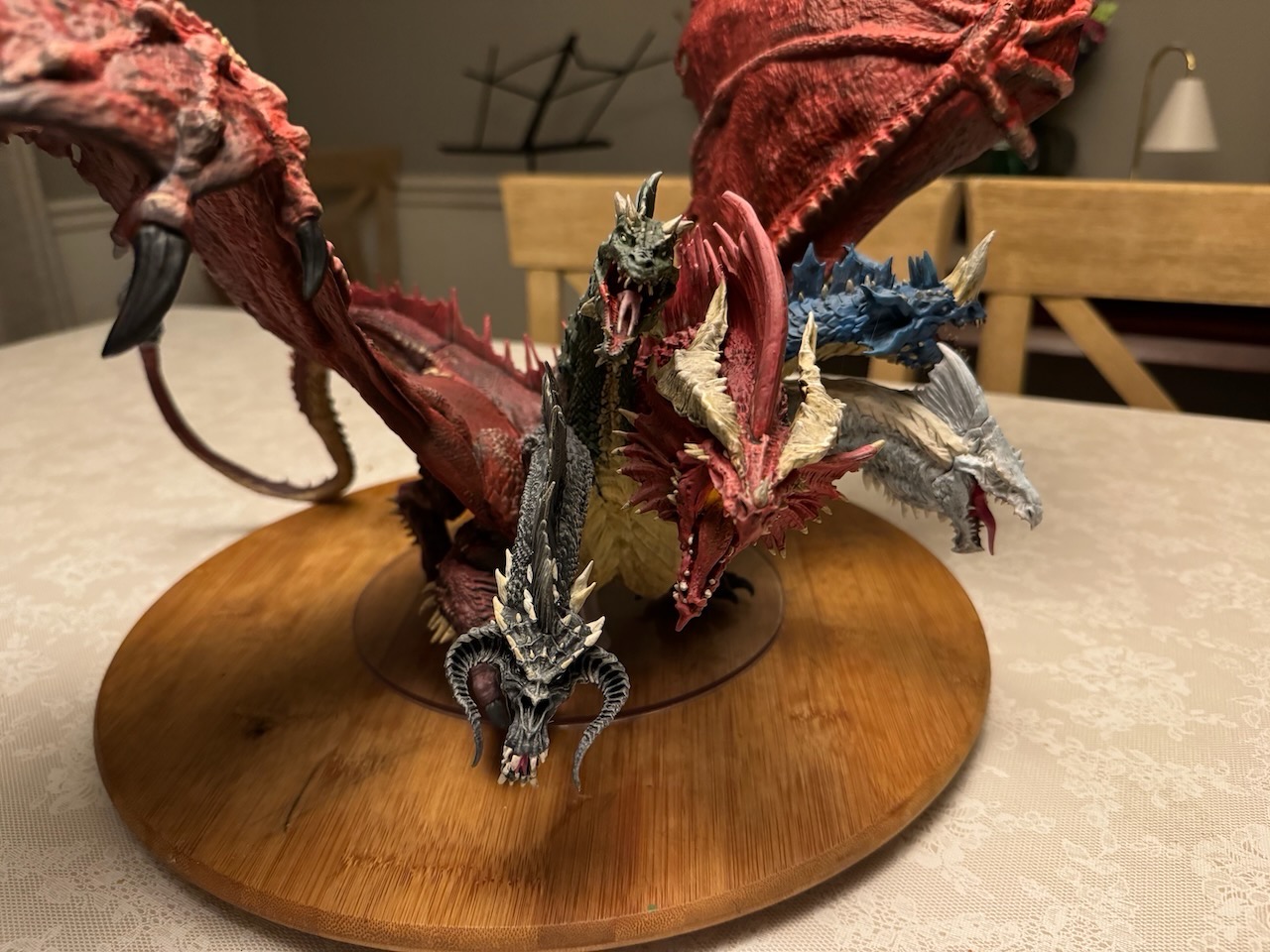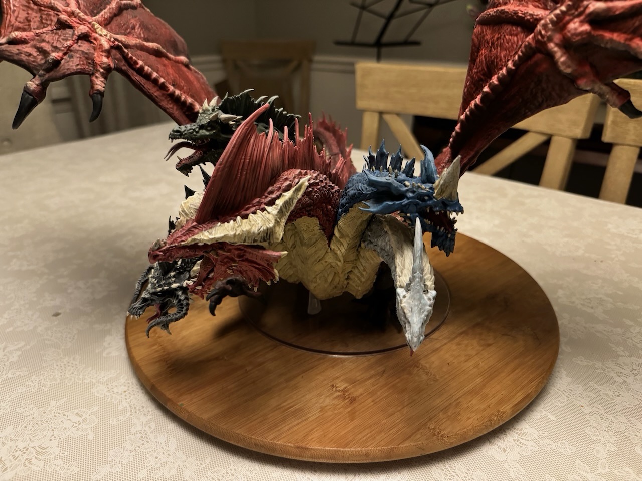 Kicked my painting game up a notch with this beast. I hesitate to even call this a Dungeons and Dragons "miniature" due to the sheer size of this thing. At 14" tall and 28" across at the wings, and even after base coating it with some matte red spray paint, this took a ton of paint. Although I painted it for a friend, and it won't end up in my office, still super happy with the way it turned out. Clocked in close to 30 hours from priming to the finished product. I actually wouldn't mind painting one again and keeping it for myself.